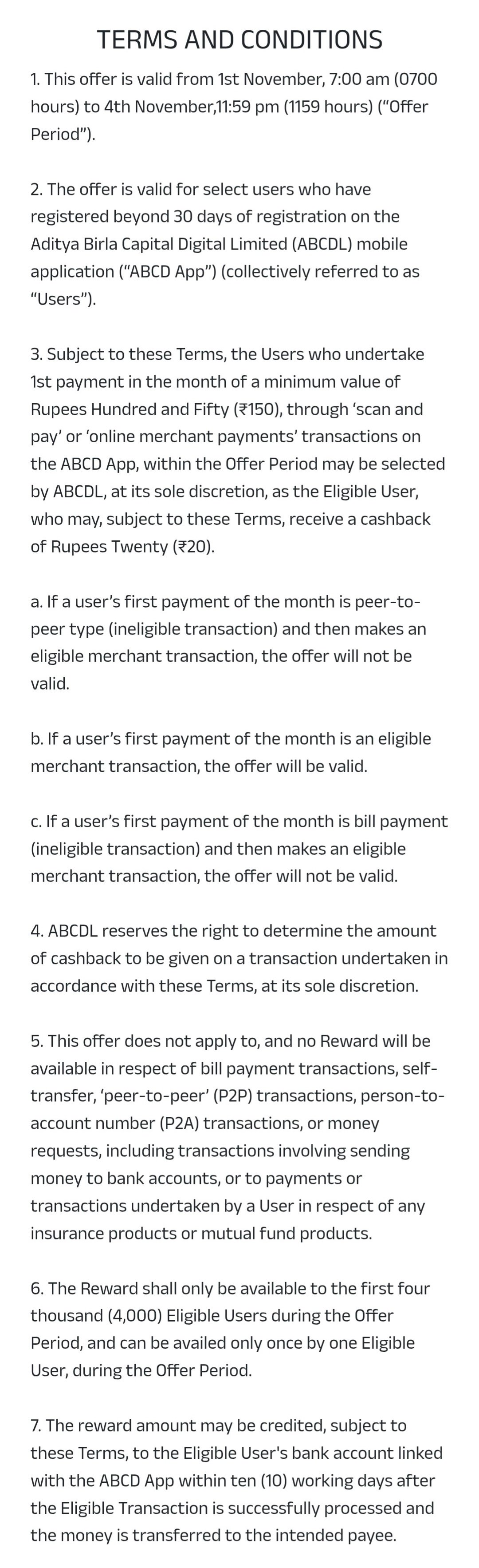 Get a flat ₹20 cashback when you make your first eligible Scan & Pay or Online Merchant Payment of minimum ₹150 using ABCD UPI.