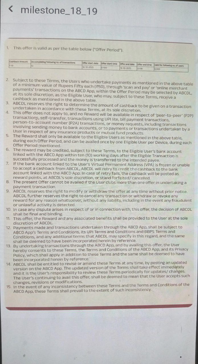 - Cashback Credit: Credited to your bank account linked with the ABCD App within 10 working days.