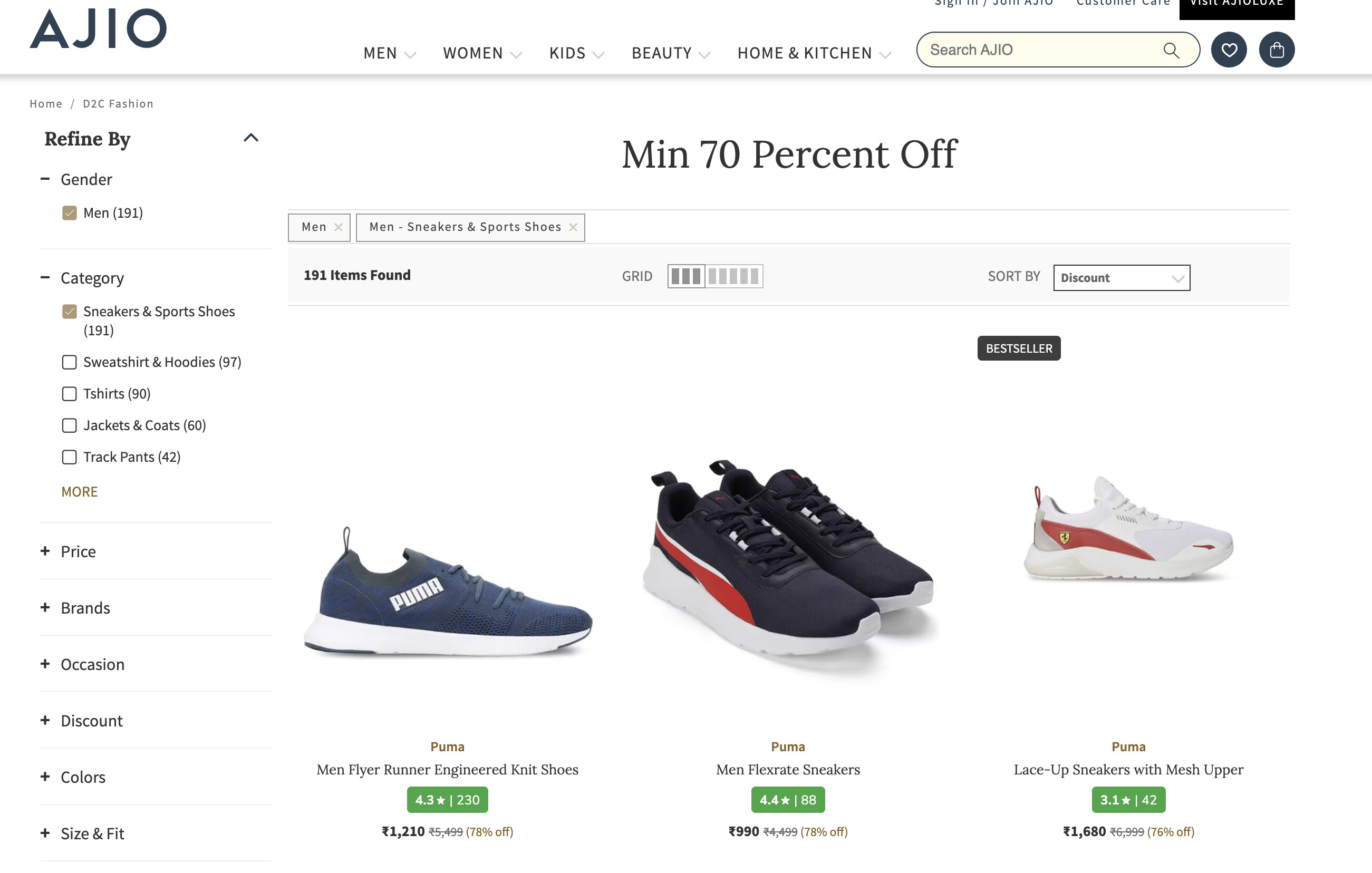 Discover fantastic savings on Puma men's shoes at AJIO! Enjoy up to 70% off a wide range of styles, including trendy sneakers, performance running shoes, and comfortable casual footwear.