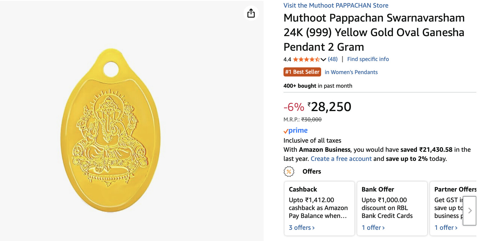 Grab an incredible offer on 24K Gold on Amazon, priced below market value. Enjoy an instant discount of ₹1500 along with additional cashback offers.
