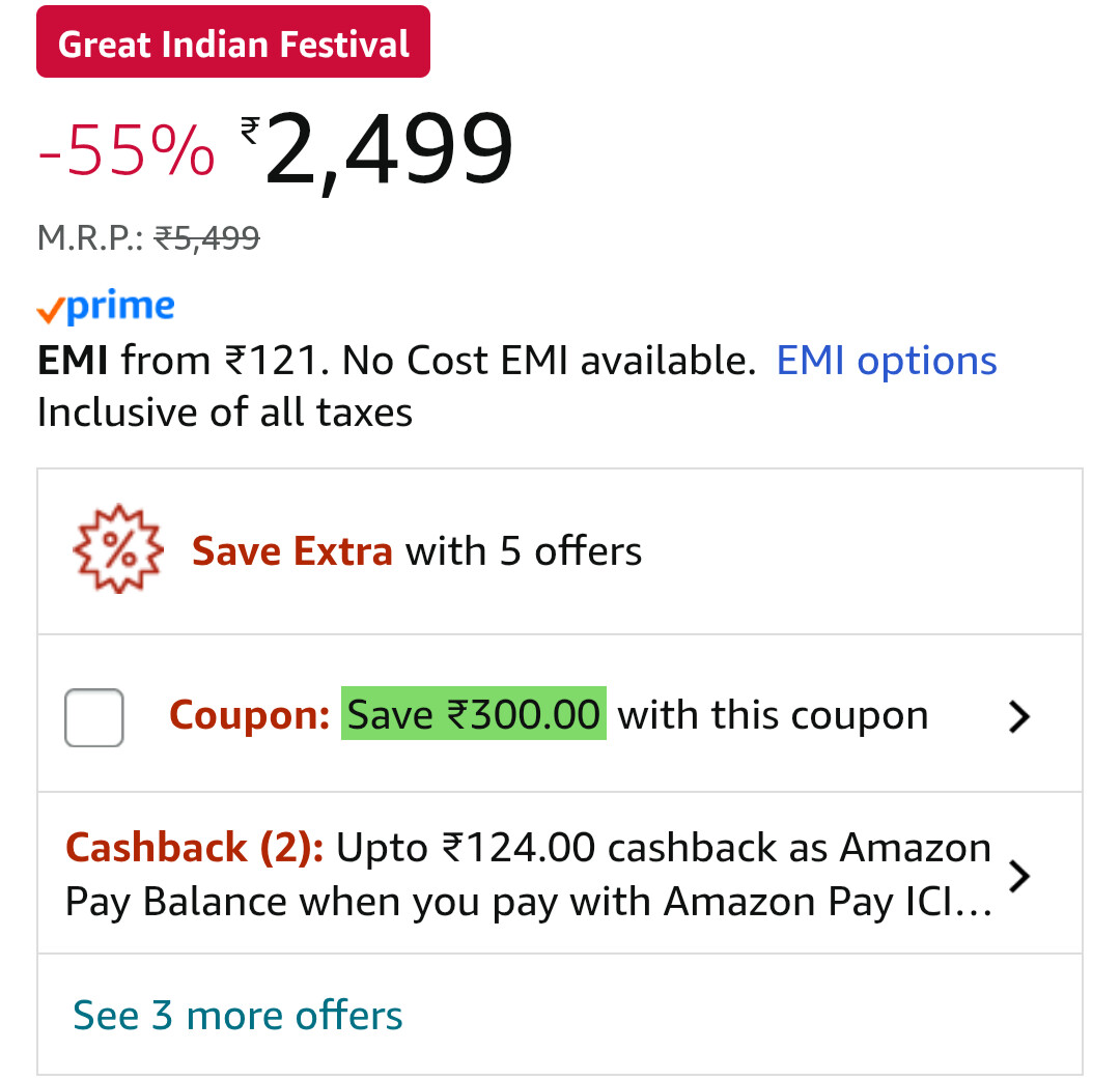 - Get 5% back with Amazon Pay ICICI Bank Credit Card for Prime members (3% back for others).