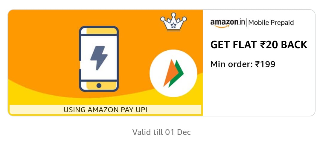 Get ₹20 cashback on your Amazon Prepaid Mobile Recharge of minimum ₹199. This is a user-specific offer.