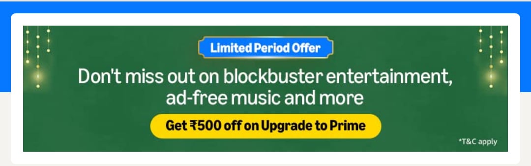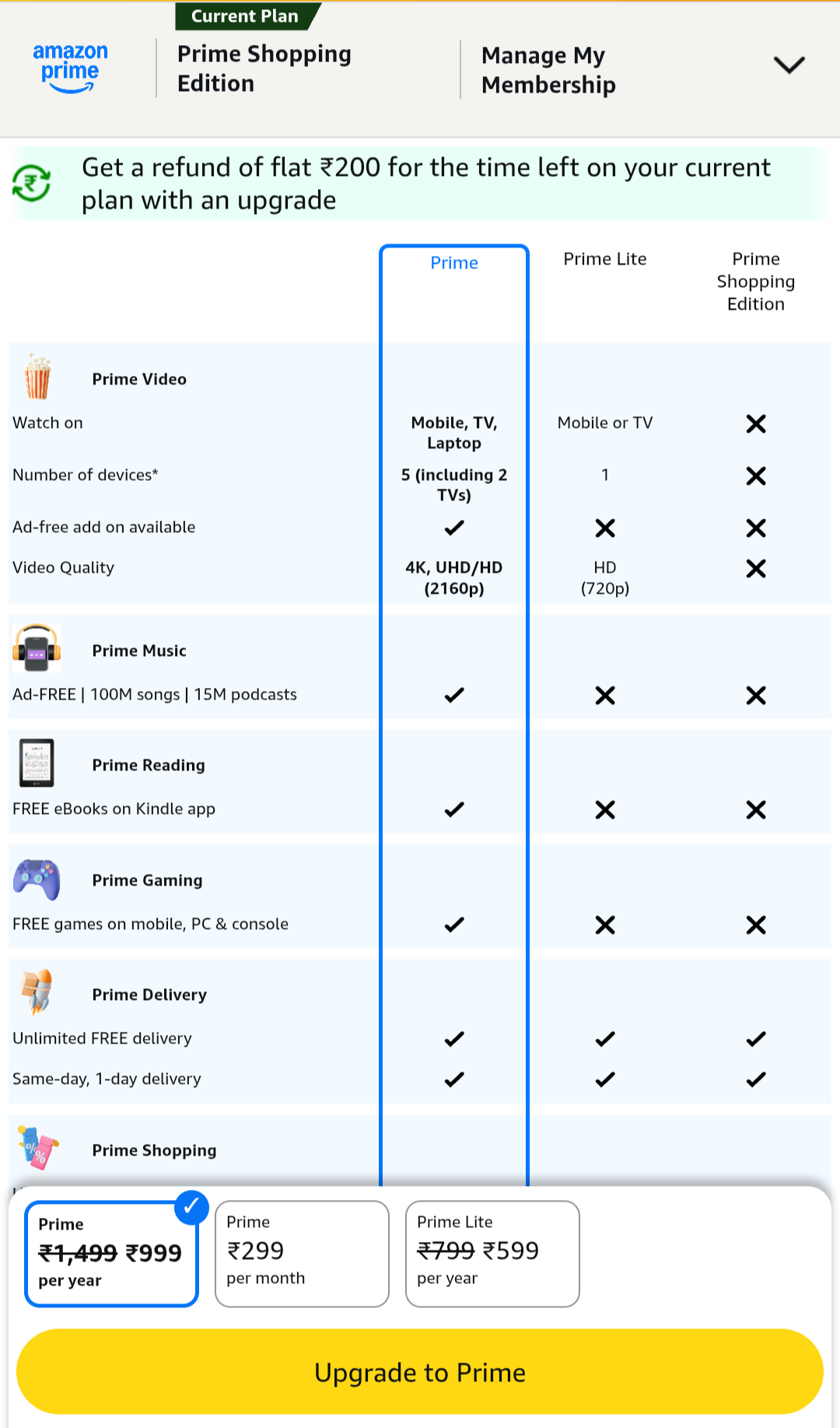 Upgrade your Amazon Prime or Prime Lite membership and save ₹500 or ₹200. This exclusive, account-specific offer is available for active Amazon Shopping Edition users. Check your Amazon app’s Prime section for eligibility. Any remaining validity on your current plan will be refunded to your Amazon Pay account upon upgrade.