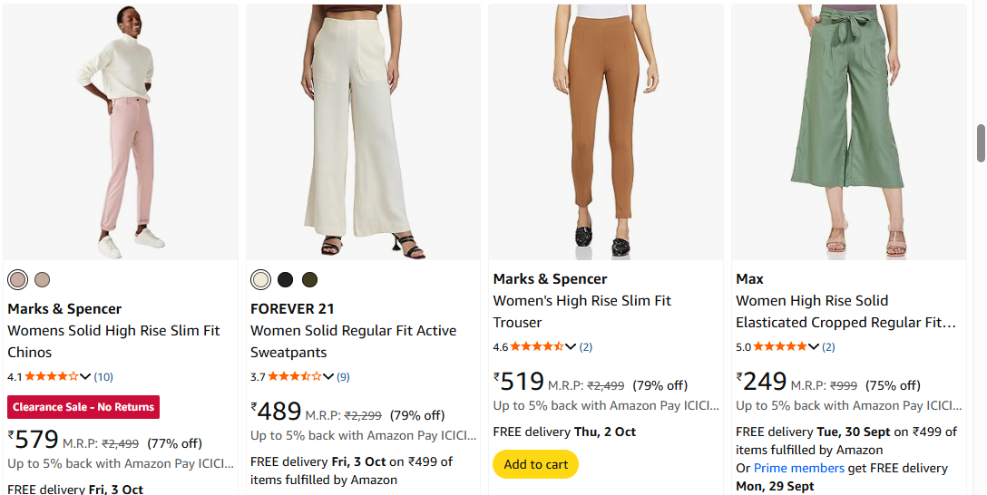 Score massive savings on women's trousers from top brands like BIBA, Max, and Marks & Spencer during this exclusive Amazon Stock Clearance Sale! Get up to 90% off on a wide range of styles and sizes.