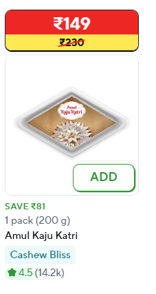 Indulge in the delicious Amul Kaju Katri, now available at a significant 35% discount on Zepto! Grab this sweet treat for just ₹149.