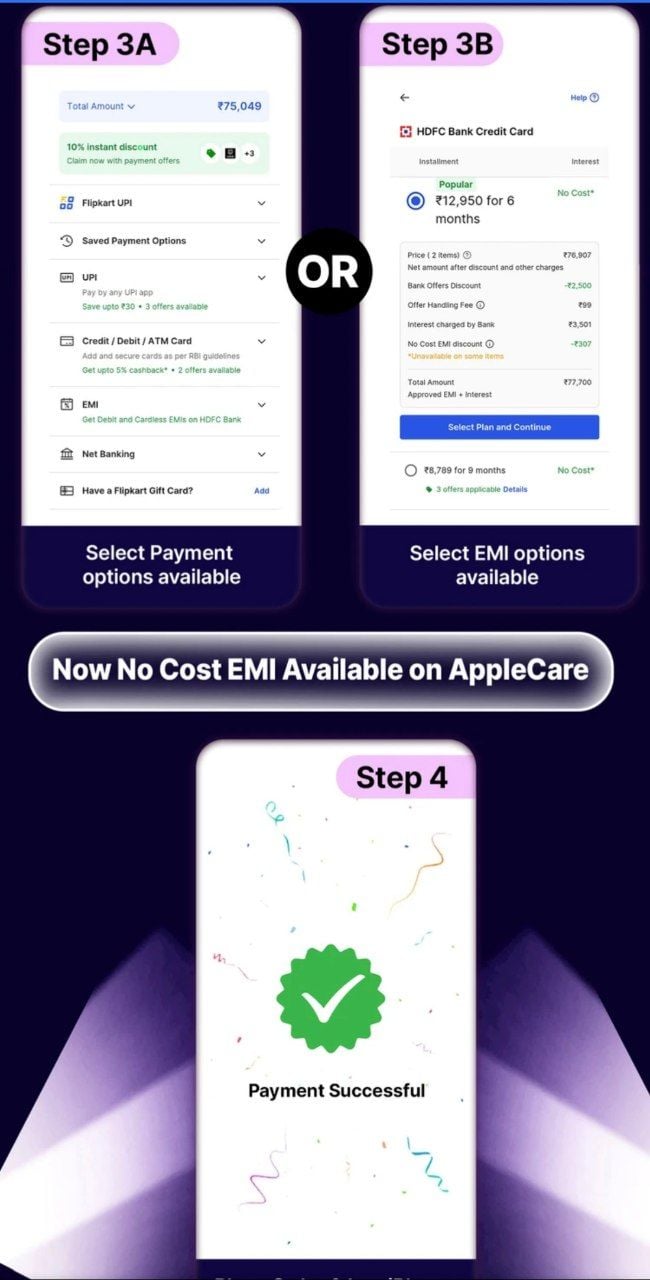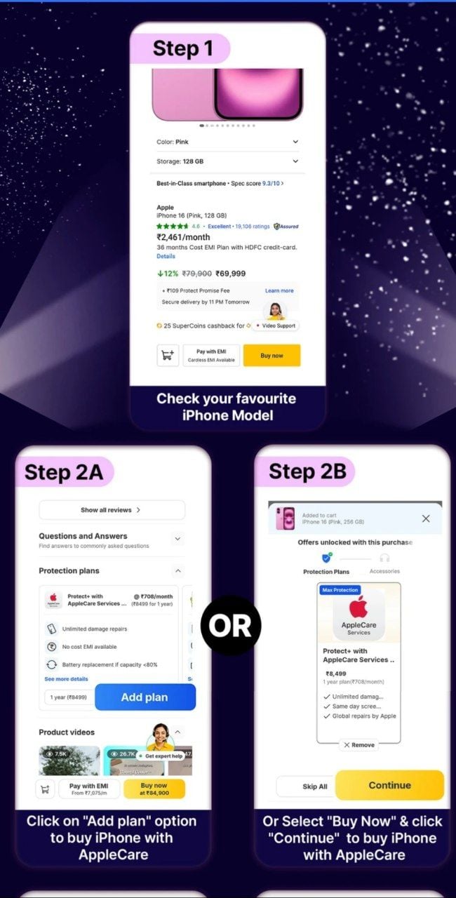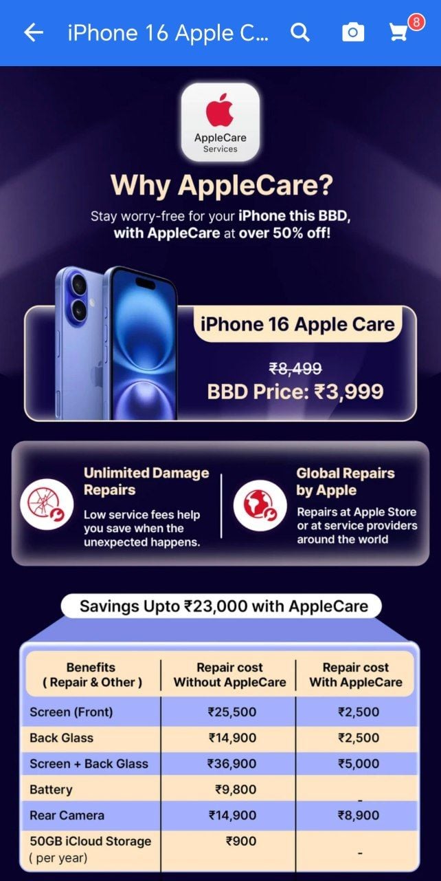 Get AppleCare for your iPhone on Flipkart for just ₹3999 (originally ₹8499), saving 53%. Protect your device with Apple’s extended warranty and support. No Cost EMI option is also available.