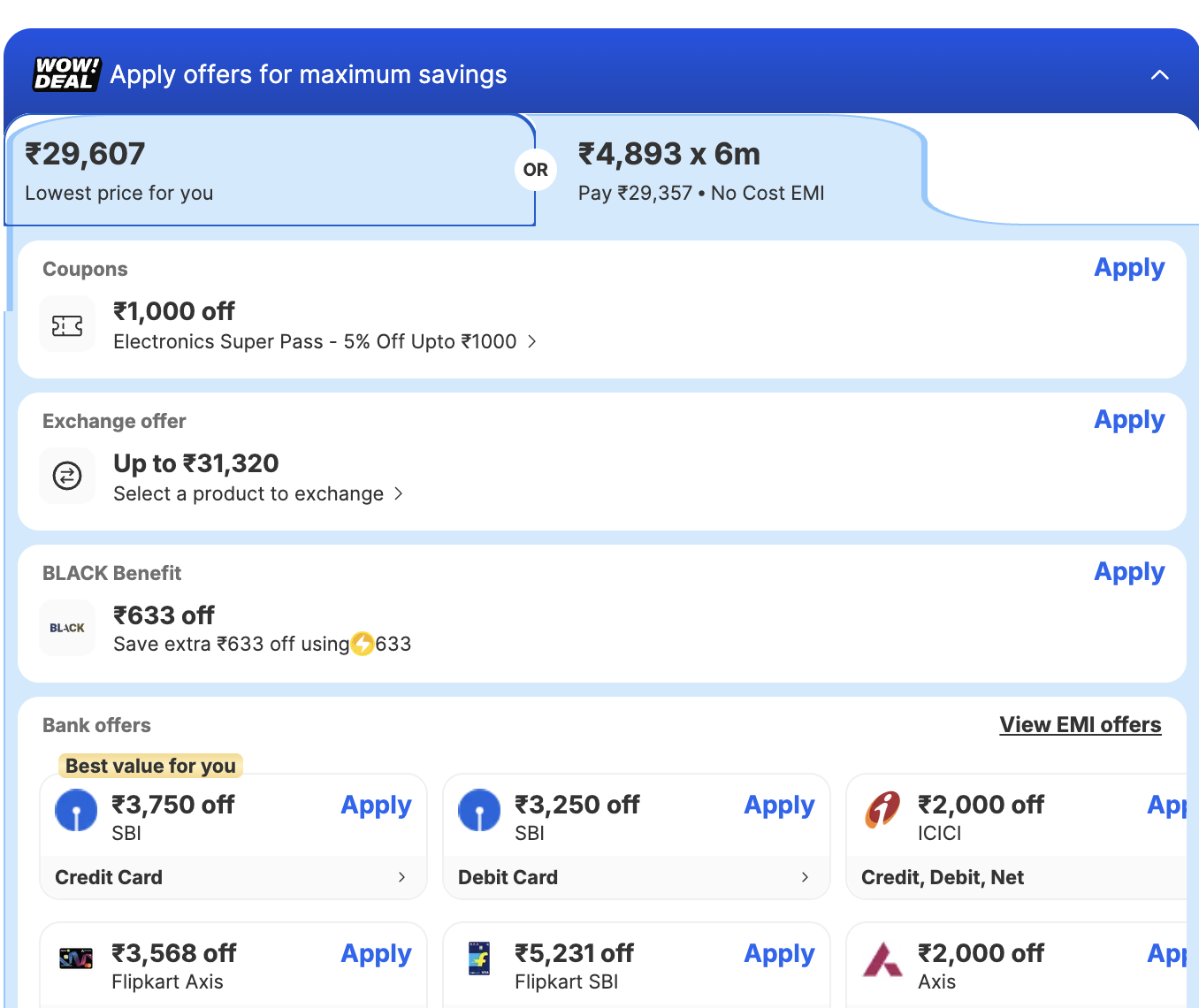 - 10% off up to ₹1,250 on Flipkart SBI Card Transactions of ₹4,990 and above