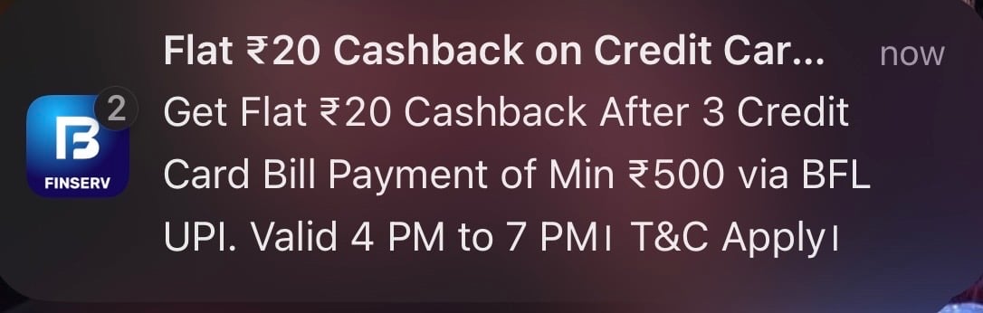 Get a flat ₹20 cashback from Bajaj Finserv when you make 3 credit card bill payments of a minimum ₹500 each, using BFL UPI.