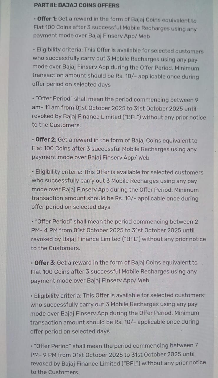 Earn 100 Bajaj Coins with Bajaj Finserv by completing 3 mobile recharges of at least ₹10 each.