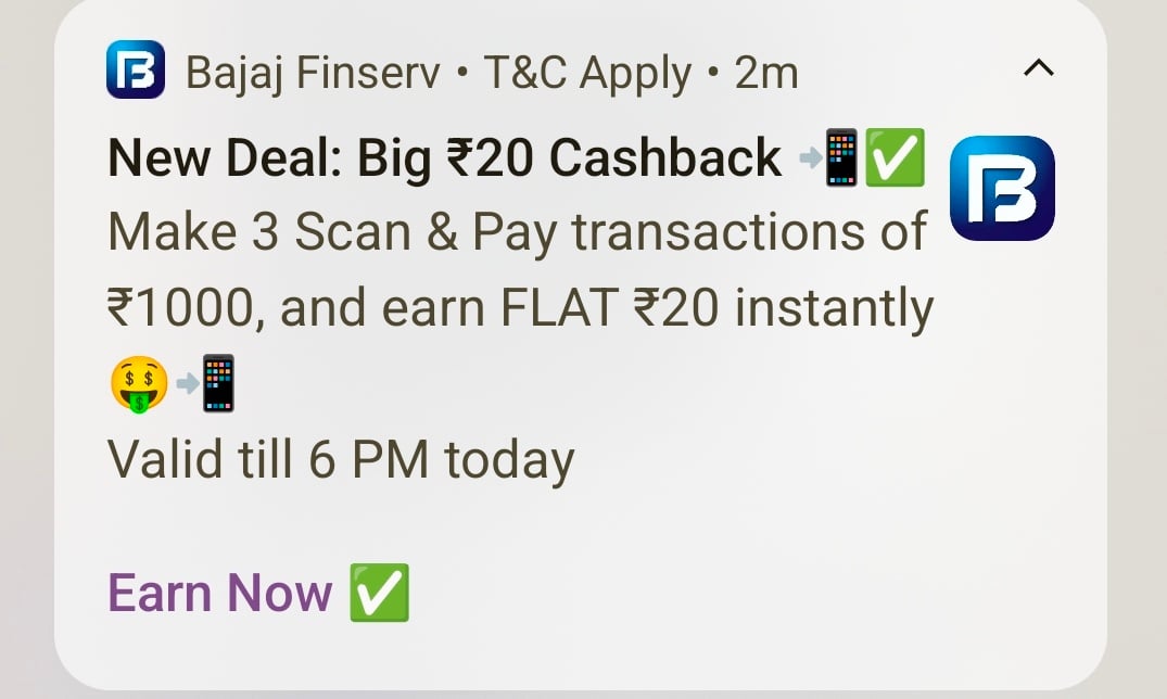 Maximize your savings with this exclusive Bajaj Finserv offer! Get a flat ₹20 cashback when you complete 3 UPI Scan & Pay transactions.