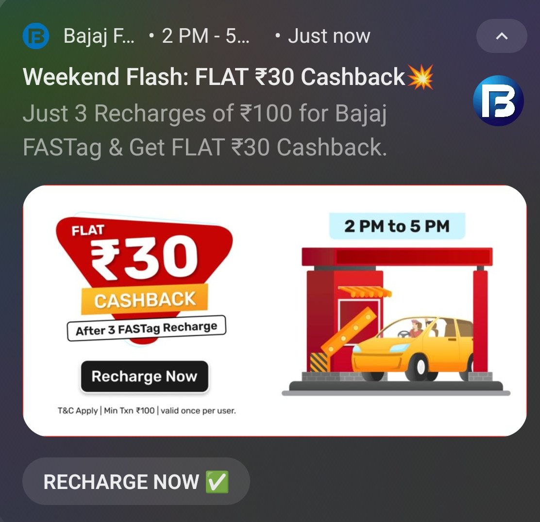 Grab an exclusive offer from Bajaj Finserv! Get a flat ₹30 cashback when you recharge your Bajaj Fastag.