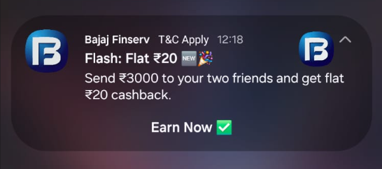 Get a flat ₹20 cashback from Bajaj Finserv! Simply send ₹3000 to two different friends using the Bajaj Finserv platform to qualify for this exclusive offer. Limited period promotion.