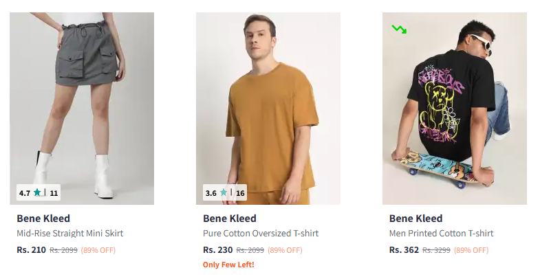 Discover incredible savings on Bene Kleed fashion! Get up to 89% off a wide range of styles, with prices starting from just ₹210. Refresh your wardrobe with trendy apparel at unbeatable prices.