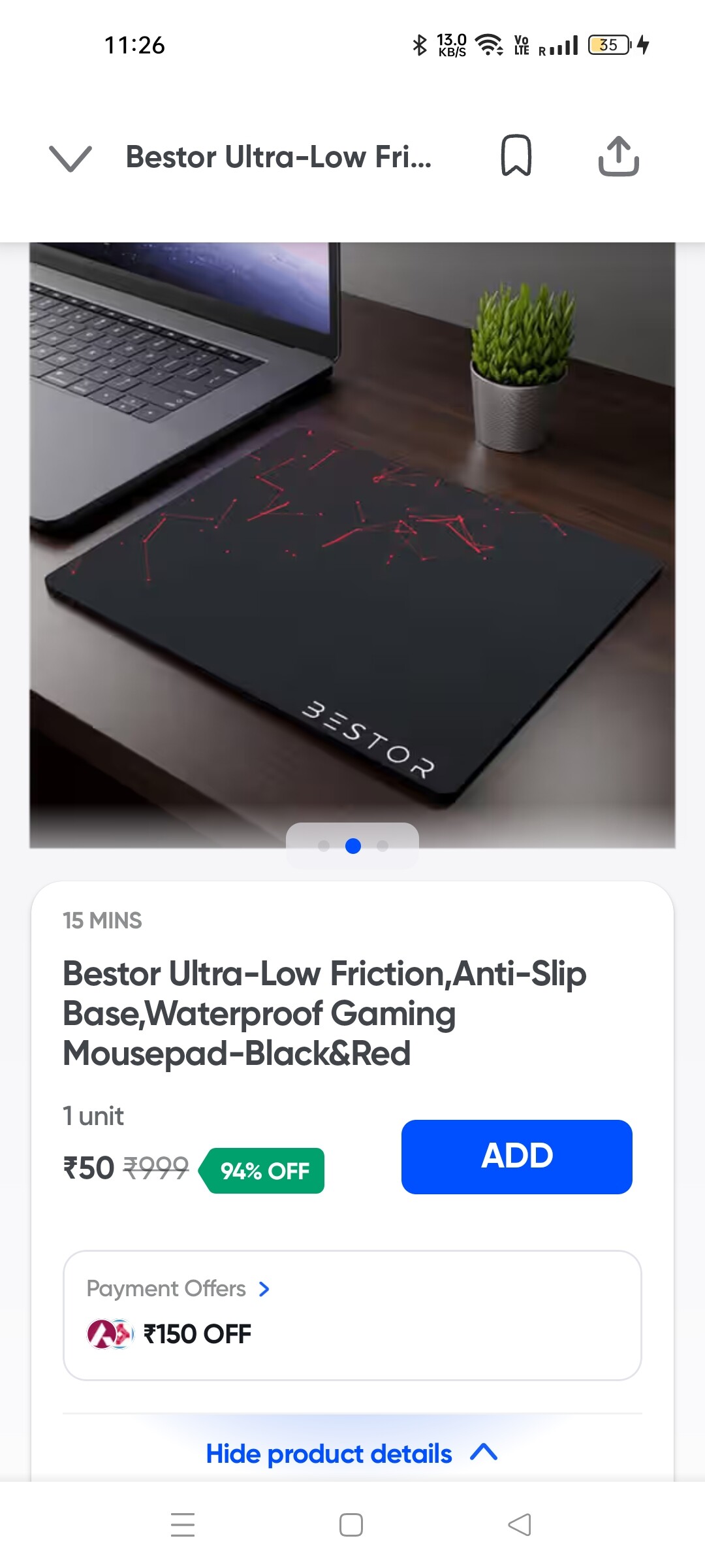Grab the Bestor Ultra-Low Friction Waterproof Gaming Mousepad in Black & Red. This high-performance mousepad features an anti-slip base and durable, waterproof surface, ensuring precision and longevity for all your gaming sessions. Get an incredible 95% discount on this essential gaming accessory! A similar product is available on Flipkart for ₹137. Buy now on Swiggy Instamart: https://www.swiggy.com/stores/instamart/item/4BMWGZ7WDB
