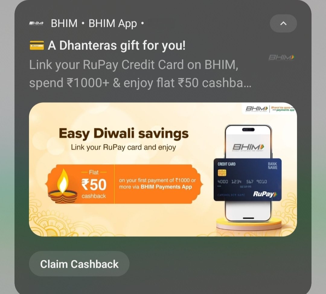 Get a flat ₹50 cashback on your first payment of ₹1000 or more using your RuPay Credit Card linked on the BHIM App. A perfect offer for your festive season savings!