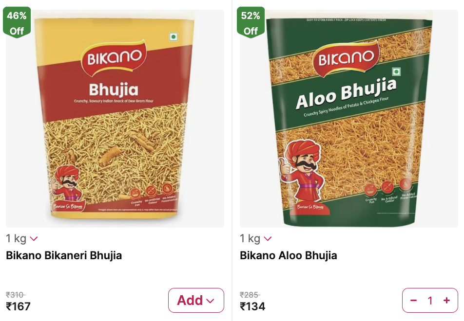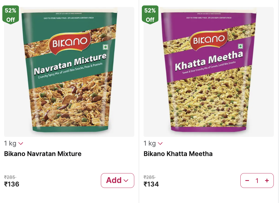 Grab Bikano Namkeen 1kg packs at a massive 53% discount on Flipkart Minutes. Originally ₹285, now available for just ₹134! This exclusive offer is available in select Delhi NCR locations only, with product availability varying by store. Check your local Flipkart Minutes store for details.