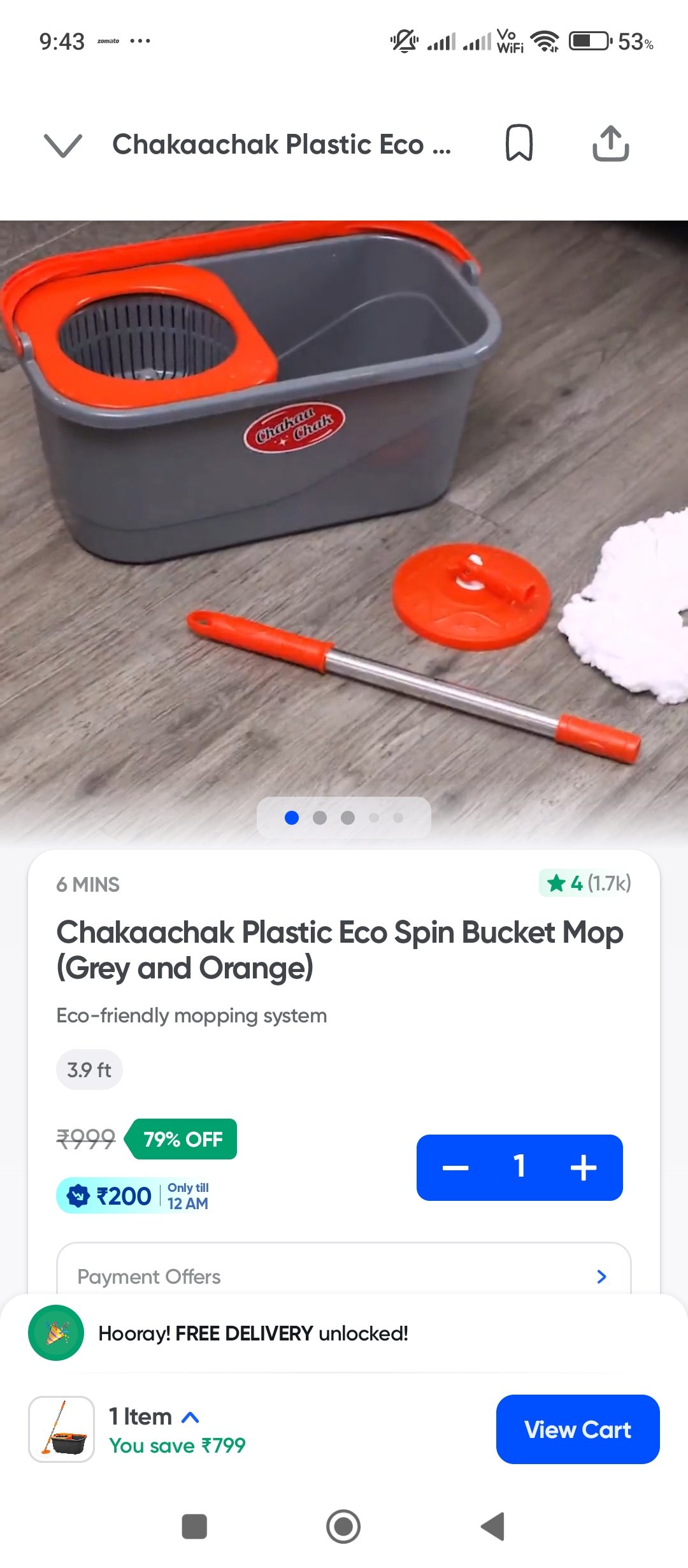This efficient eco spin mop makes cleaning effortless. Its durable plastic bucket and powerful spin mechanism ensure a sparkling clean floor with minimal effort. Perfect for all your home cleaning needs. Originally priced at ₹999, now available for just ₹200 on Swiggy Instamart (availability may vary by location). Don’t miss this limited-time offer!