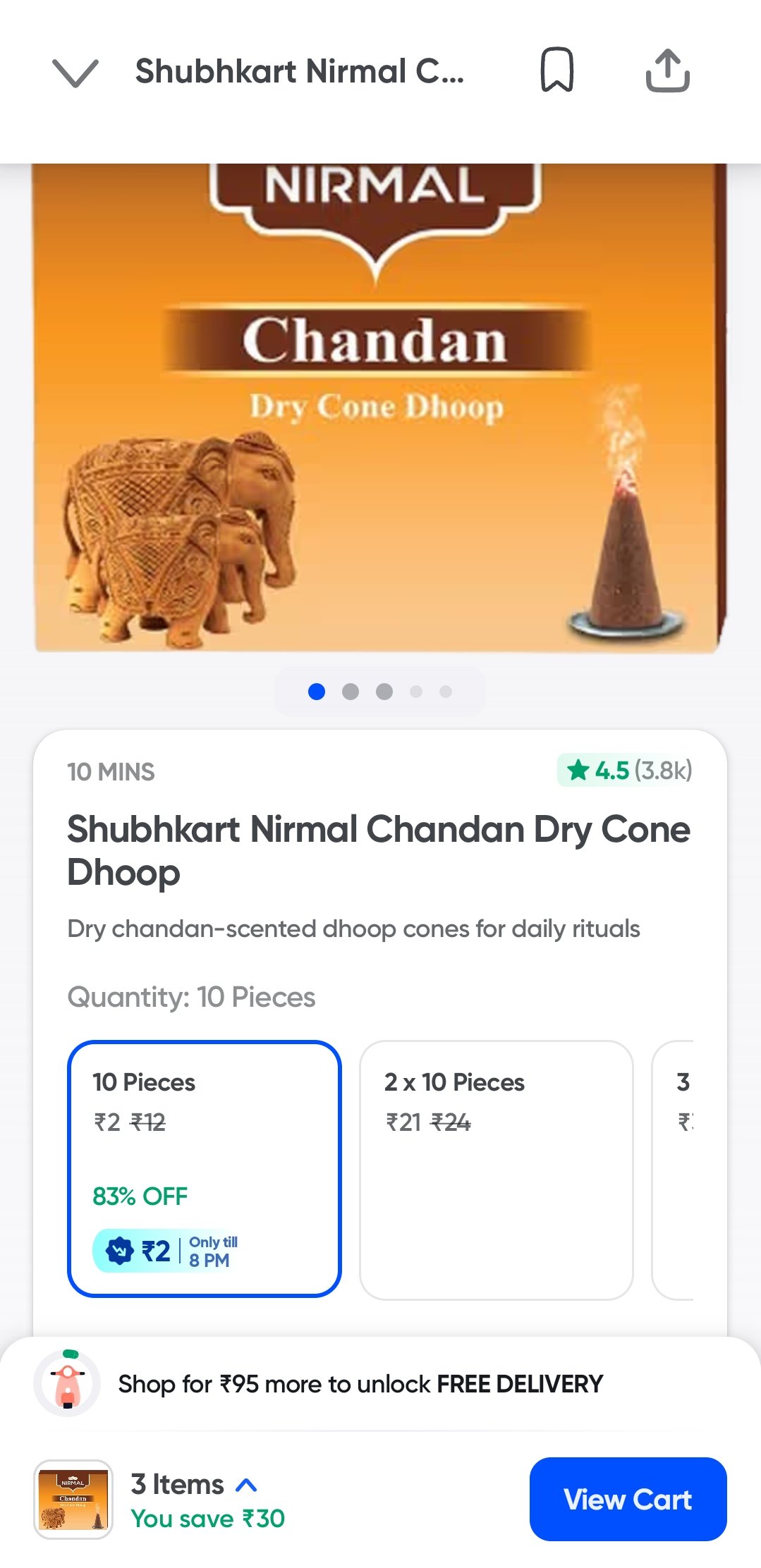 Discover great savings on Chandan Dry Cone Dhoop. This pack includes 10 aromatic dhoop cones, perfect for meditation, prayers, or creating a serene ambiance. Get an amazing 83% discount on your purchase!