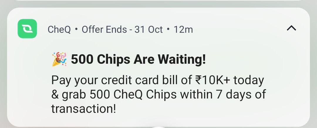 Pay your credit card bill of ₹10,000 or more via the CheQ app and earn 500 CheQ Chips. These chips will be credited to your account within 7 days of the successful transaction.