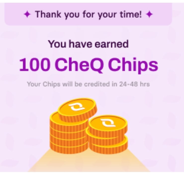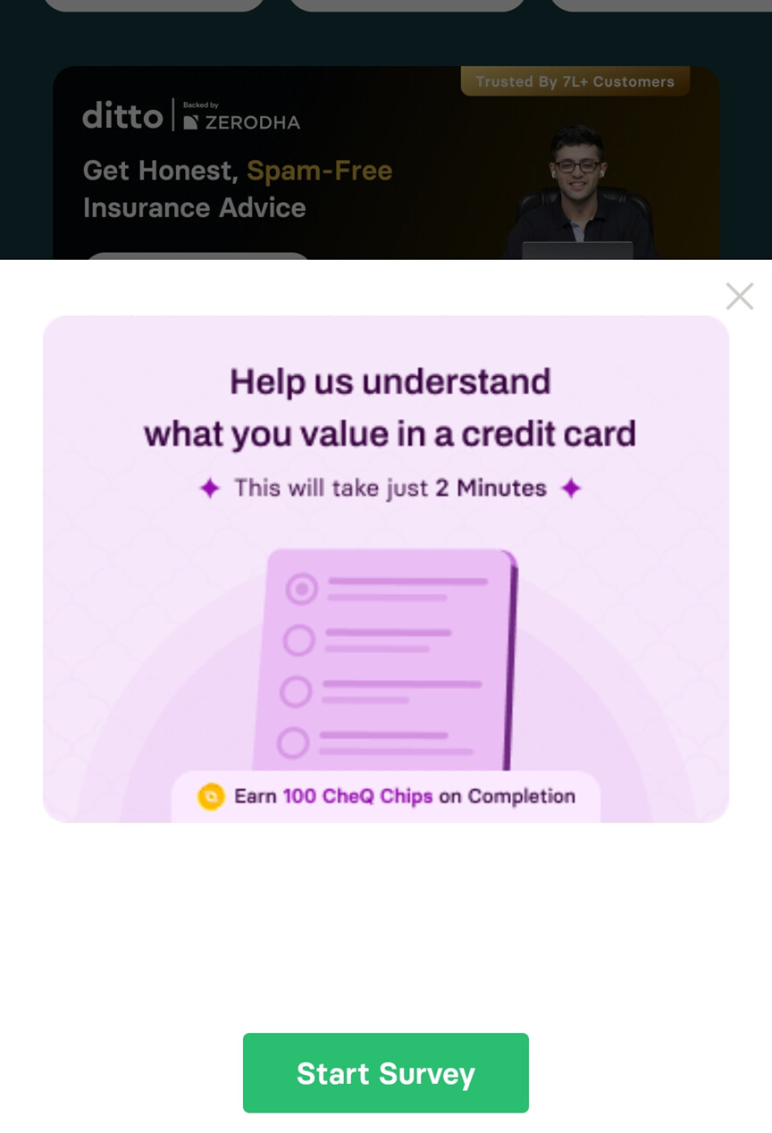Participate in a quick survey on the CheQ App and earn 100 chips, equivalent to ₹10. This brief survey helps us understand your preferences regarding credit cards.