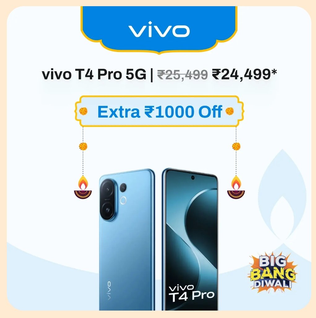 - Extra ₹1000 Off on Vivo T4 Pro 5G (using 100 CheQ chips)