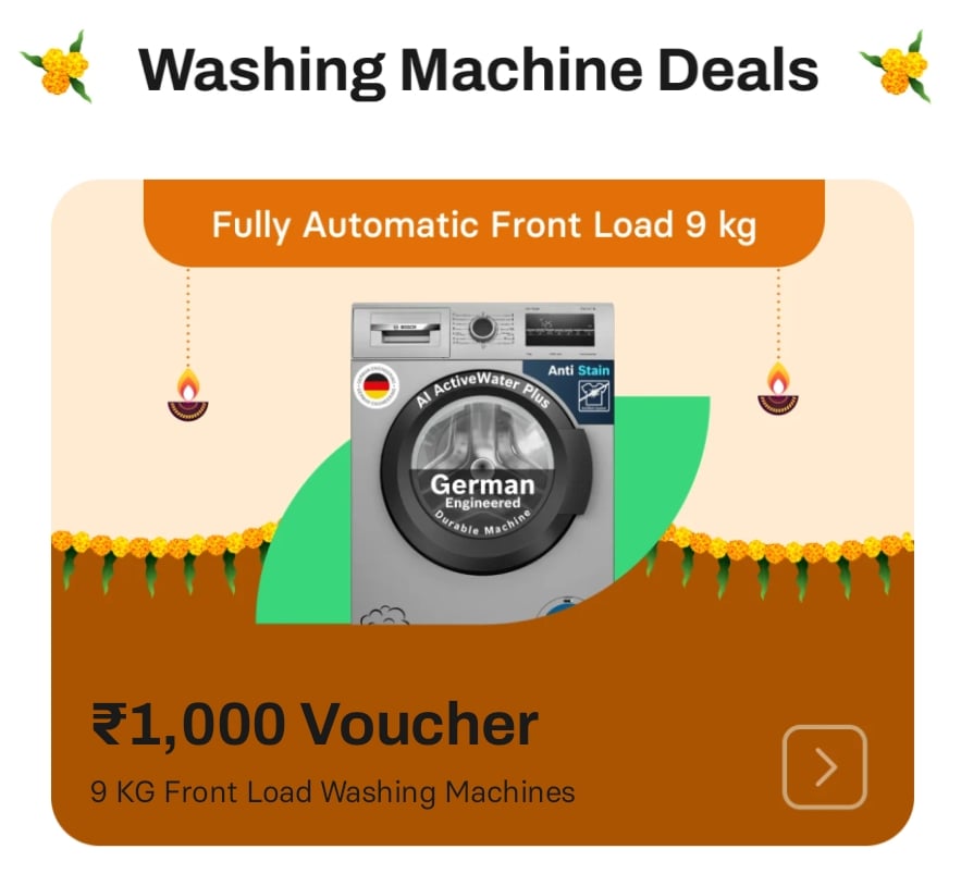 - 9kg Front Load: ₹1000 off (using 100 CheQ chips)