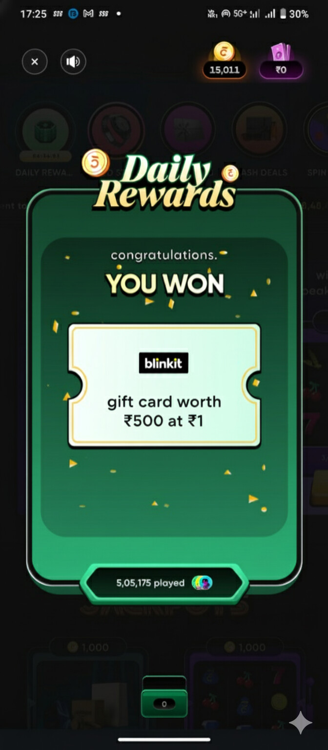 Grab a Blinkit ₹500 Gift Voucher for just ₹1 through CRED’s daily rewards. This is an all-user offer, so try your luck! Many users are successfully claiming this amazing deal.