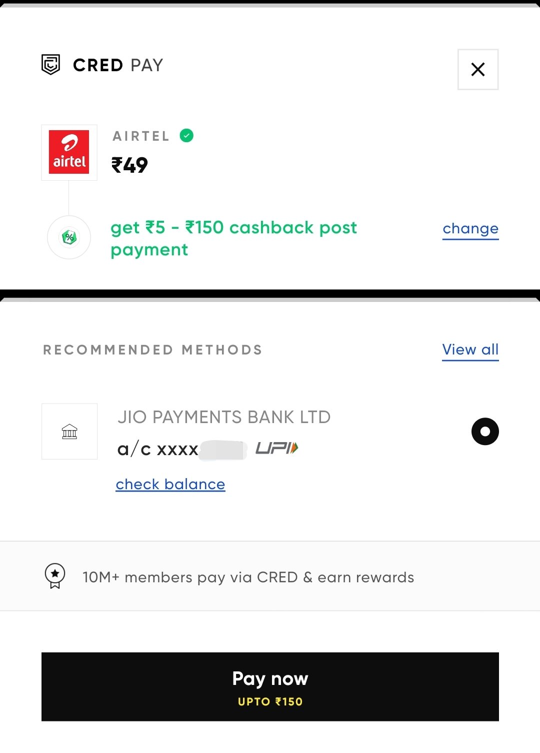 Enjoy a cashback of ₹5 to ₹150 when you make payments on Airtel using CRED UPI.