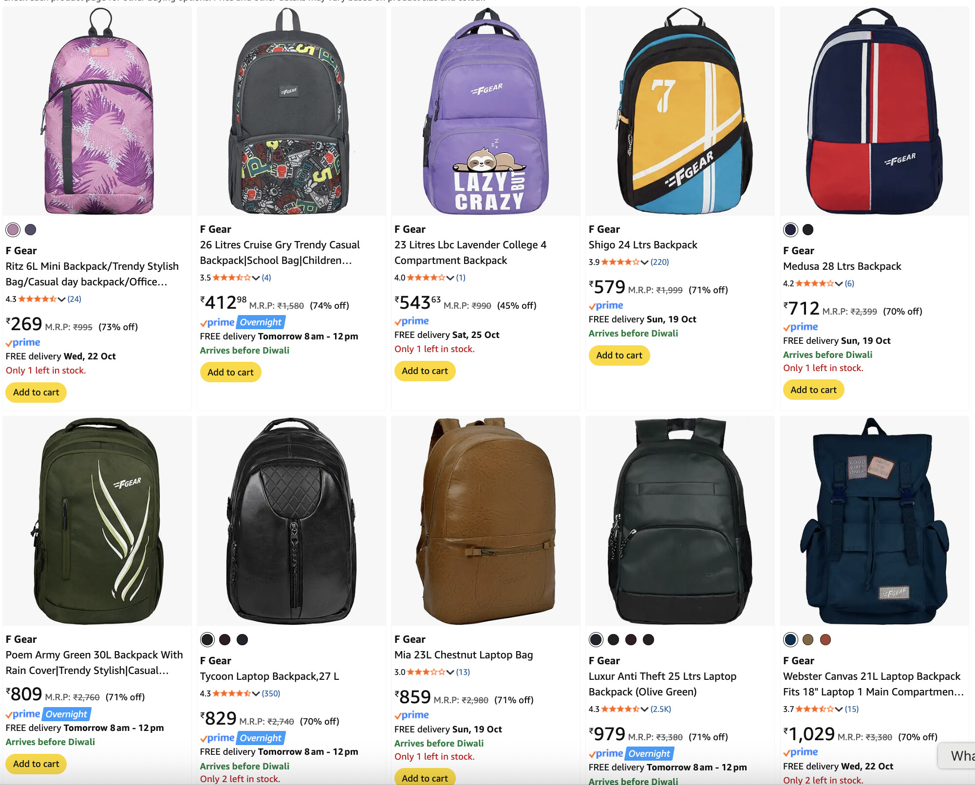 Grab fantastic deals on F Gear backpacks, starting from just ₹269 on Amazon India. These durable and stylish backpacks are perfect for daily use, travel, or college.
