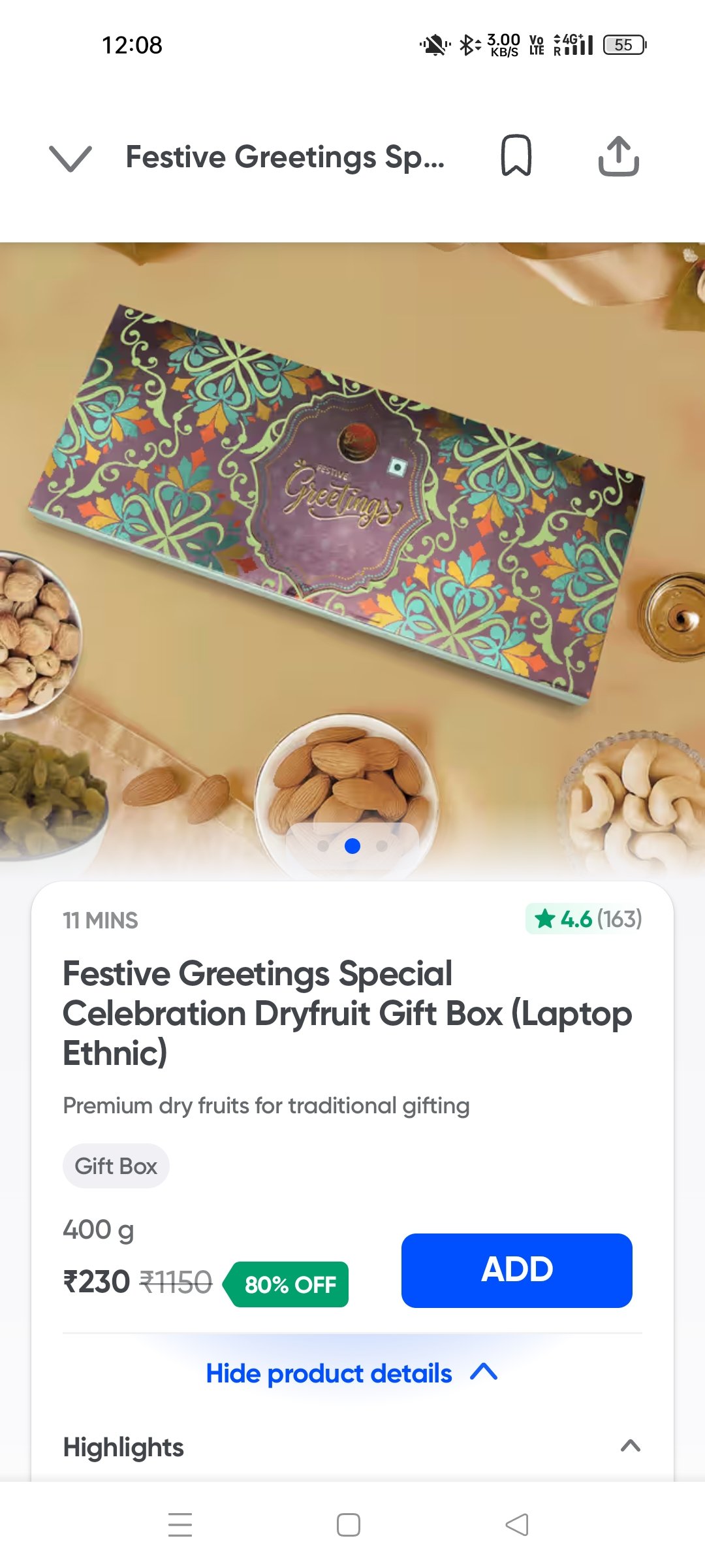 Grab an amazing deal on the Festive Dry Fruit Gift Box (400g) from Swiggy Instamart! Perfect for gifting or personal indulgence, this box includes premium Cashews, Almonds, Apricots, and Raisins.