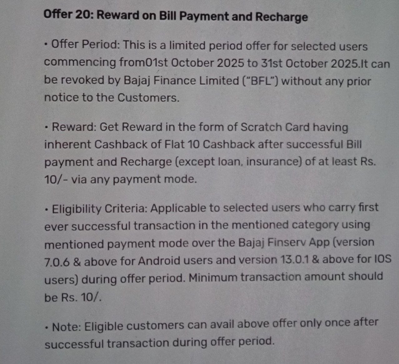 This offer is valid for selected users and applicable via any payment mode. Users receiving a notification might also find it applicable for credit card bill payments.