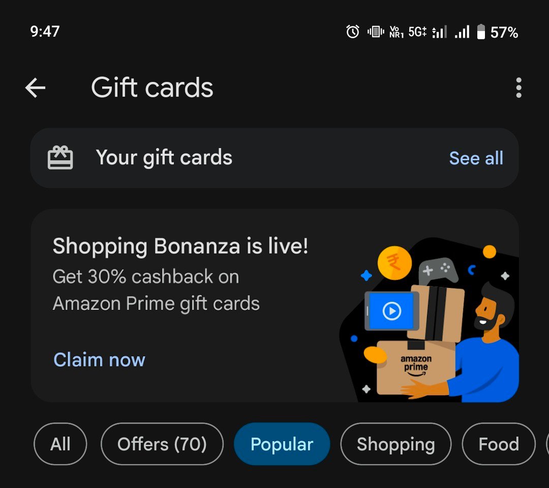 Flat 30% Cashback on Amazon Prime Gift Cards