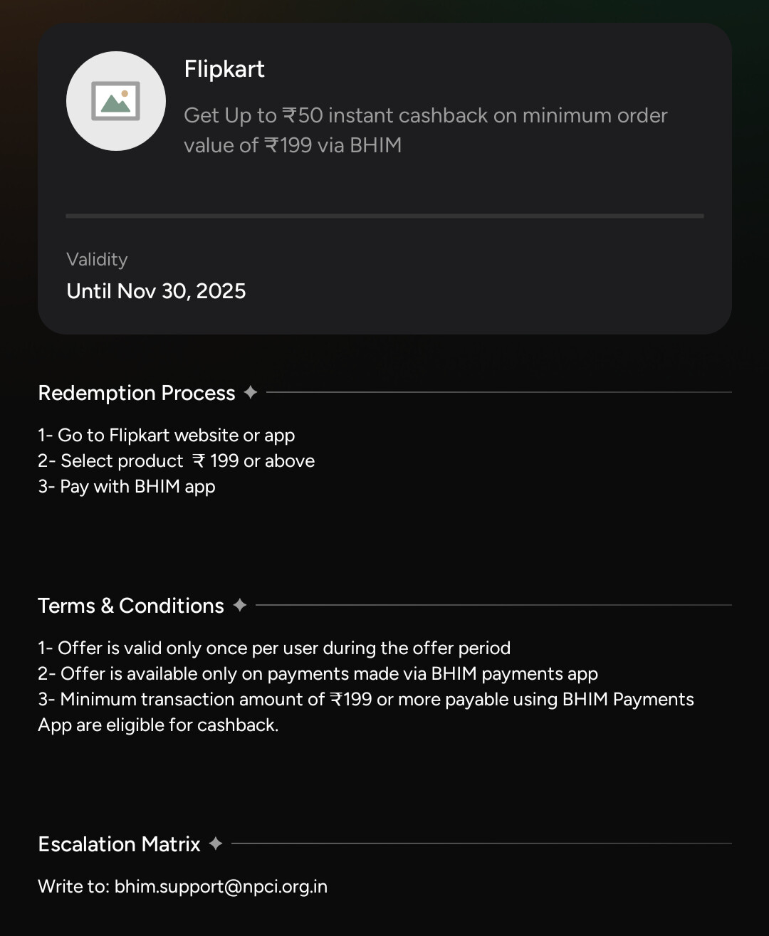 Avail a flat ₹50 cashback on your Flipkart orders with a minimum spend of ₹199 when paying via BHIM UPI.