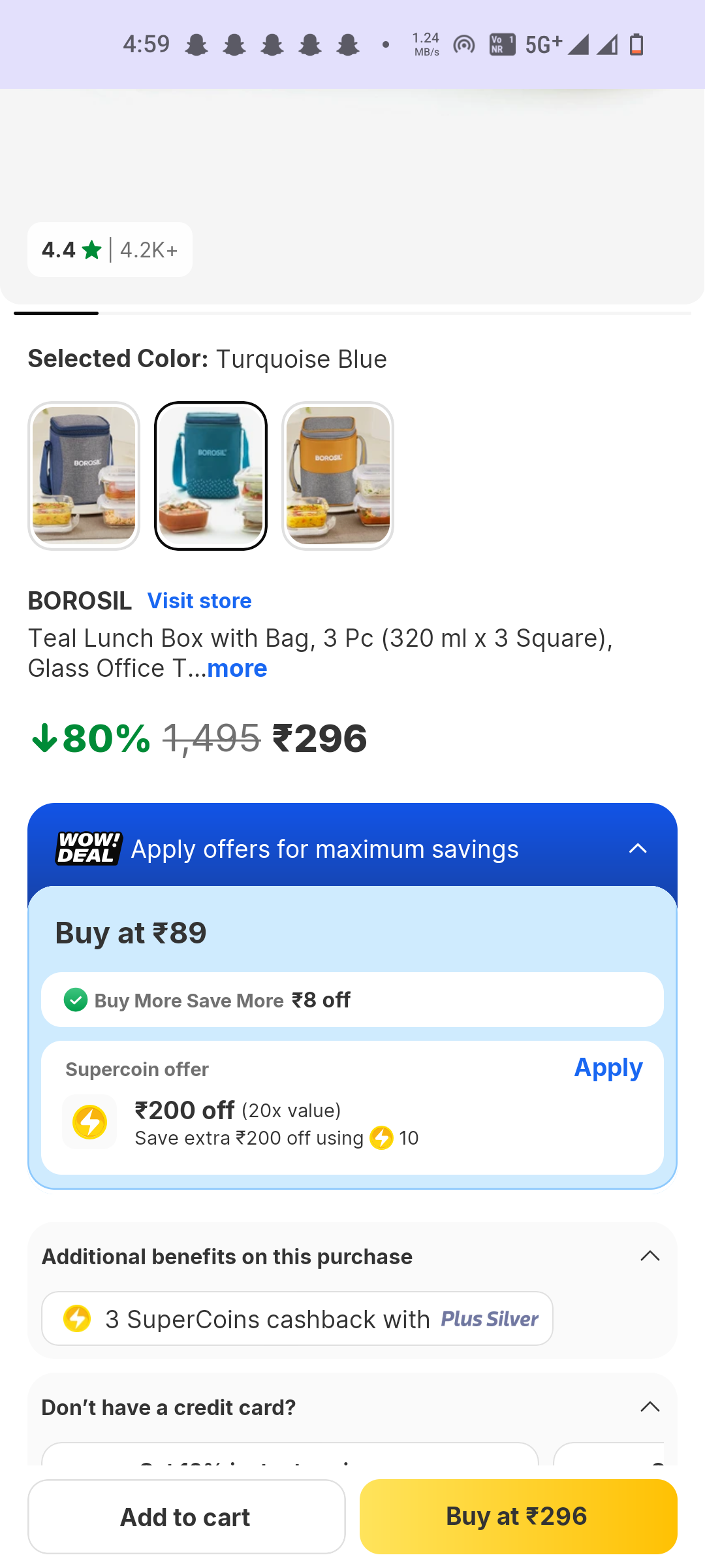Grab the Teal Glass Lunch Box with Bag, featuring 3 square containers (320 ml each), perfect for office use, available on Flipkart. Originally priced at ₹1495, get it now for just ₹89! This deal offers a massive 94% discount. You can achieve an effective price of ₹296 by utilizing 10 SuperCoins for a ₹200 discount. Enhance your meal experience with this durable and stylish tiffin set.