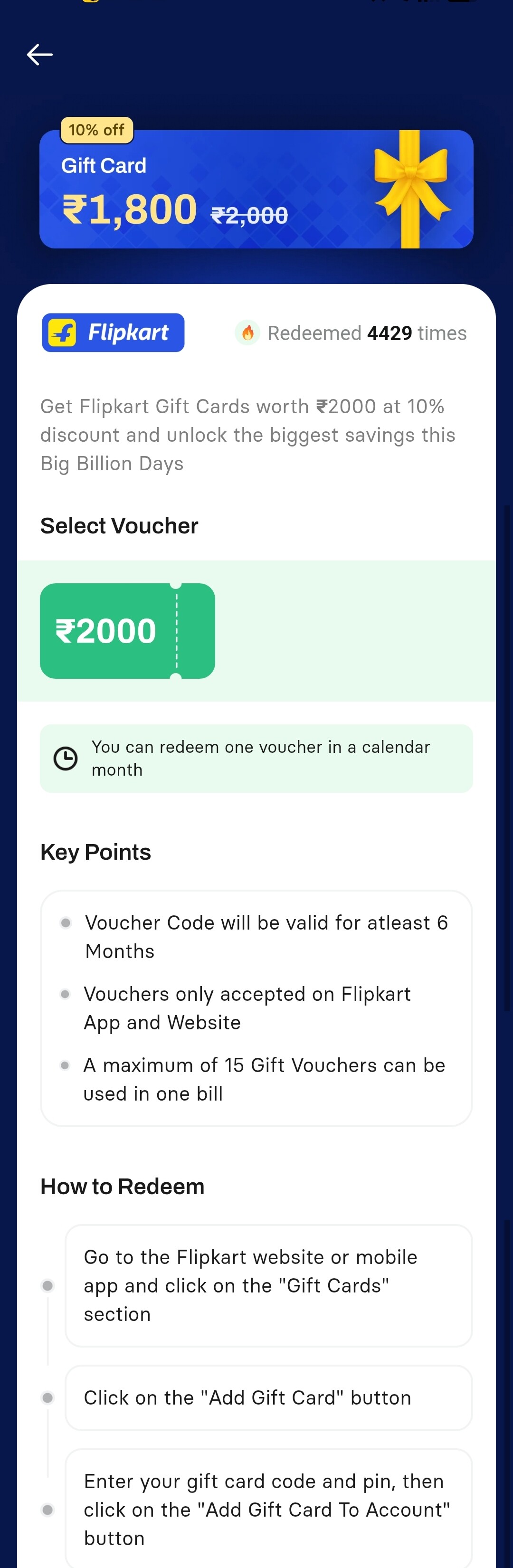 Grab a Flipkart Gift Card worth ₹2000 for just ₹1800 through the Cheq app, saving 10% on your purchase. This is a perfect opportunity to maximize your savings for upcoming Big Billion Days or any Flipkart shopping.