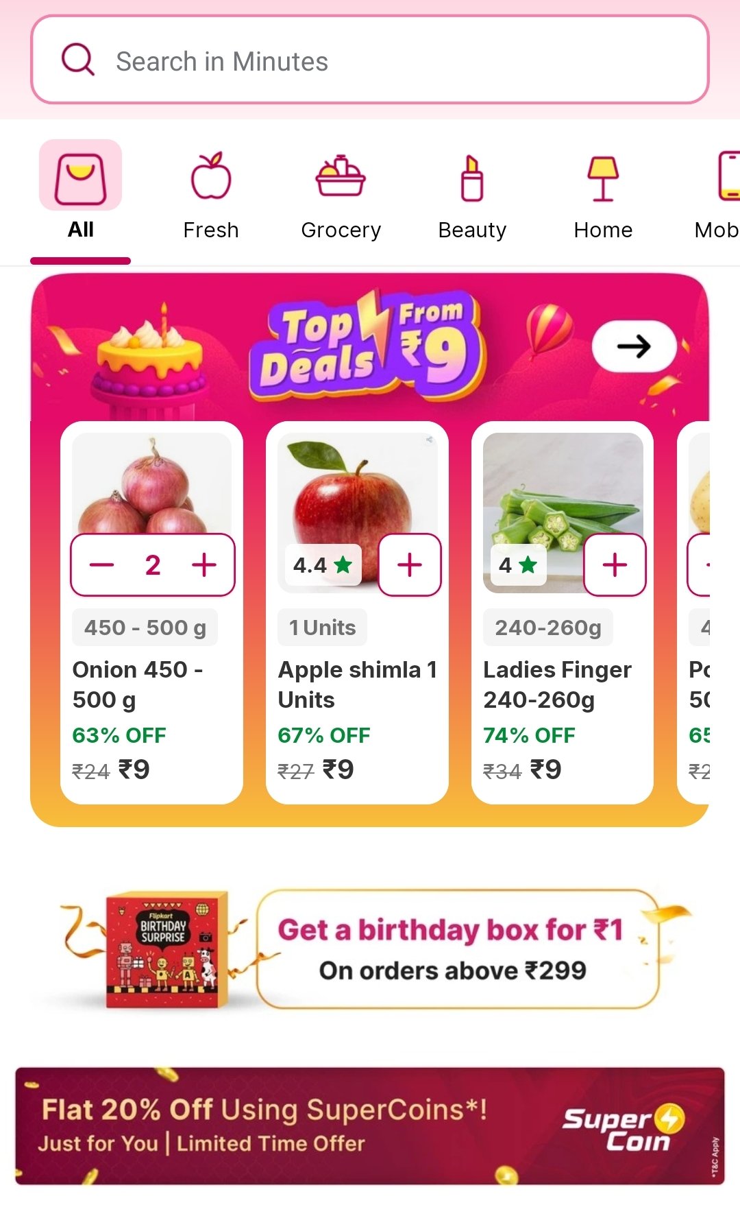 Unlock savings at Flipkart Minutes! Get up to 20% off on a wide range of products by utilizing your Flipkart SuperCoins. This limited-time offer applies to select items.