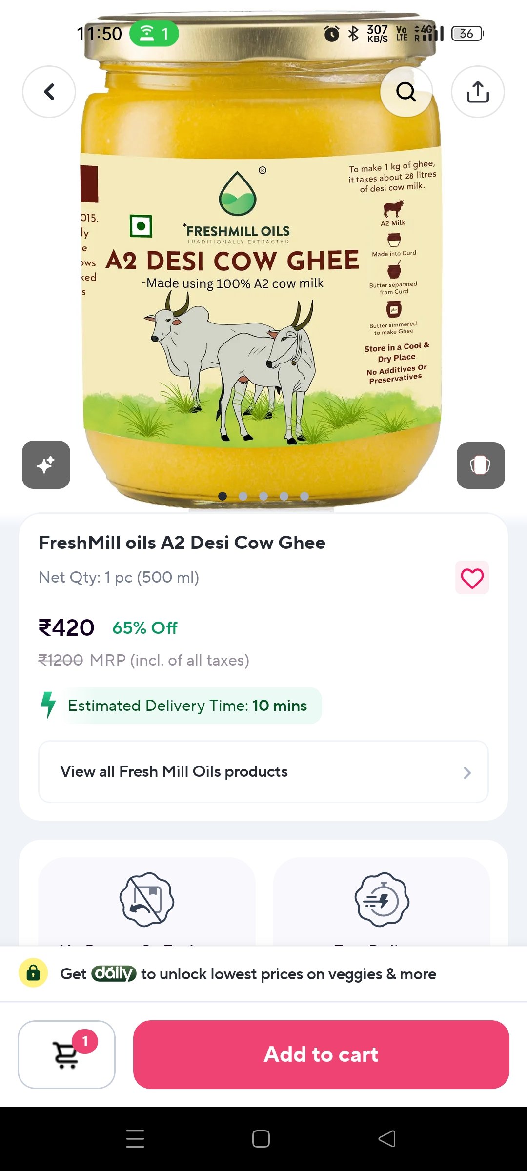 Grab FreshMill Oils A2 Desi Cow Ghee (500ml) for just ₹420 on ZeptoNow! Enjoy a massive 65% discount on the retail price of ₹1200.
