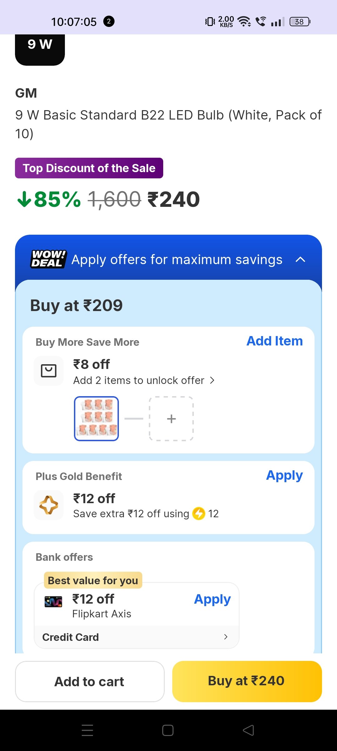 Grab this amazing deal on GM 9W Basic Standard B22 LED Bulbs in White, available in a convenient pack of 10. Enjoy a massive 87% discount, reducing the price from ₹1600 to just ₹209 on Flipkart. These energy-efficient bulbs are perfect for illuminating your home or office with bright, standard white light.