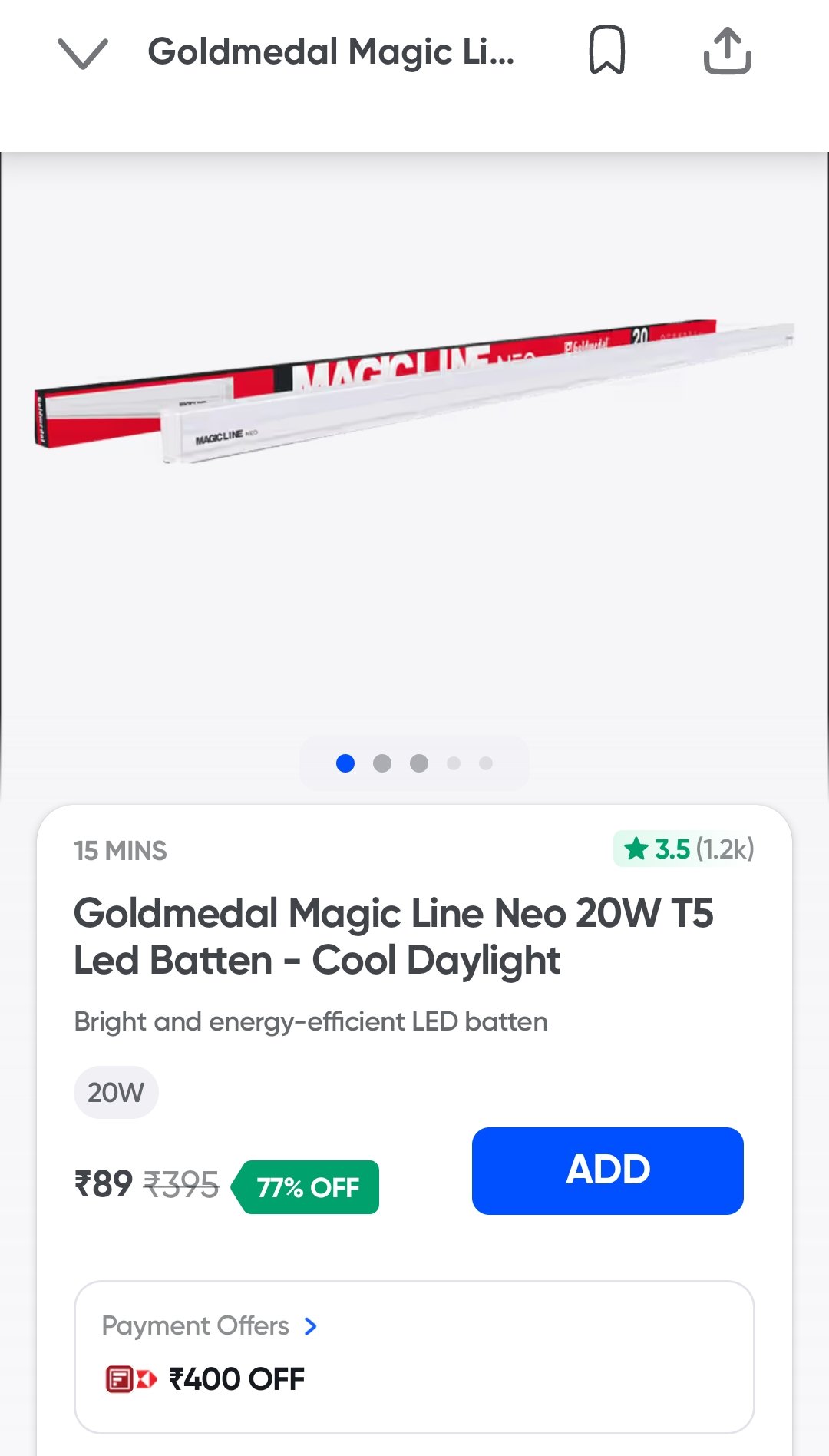 Get the Goldmedal Magic Line Neo 20W T5 LED Batten for just ₹89 (77% off its retail price of ₹395) on Swiggy Instamart!