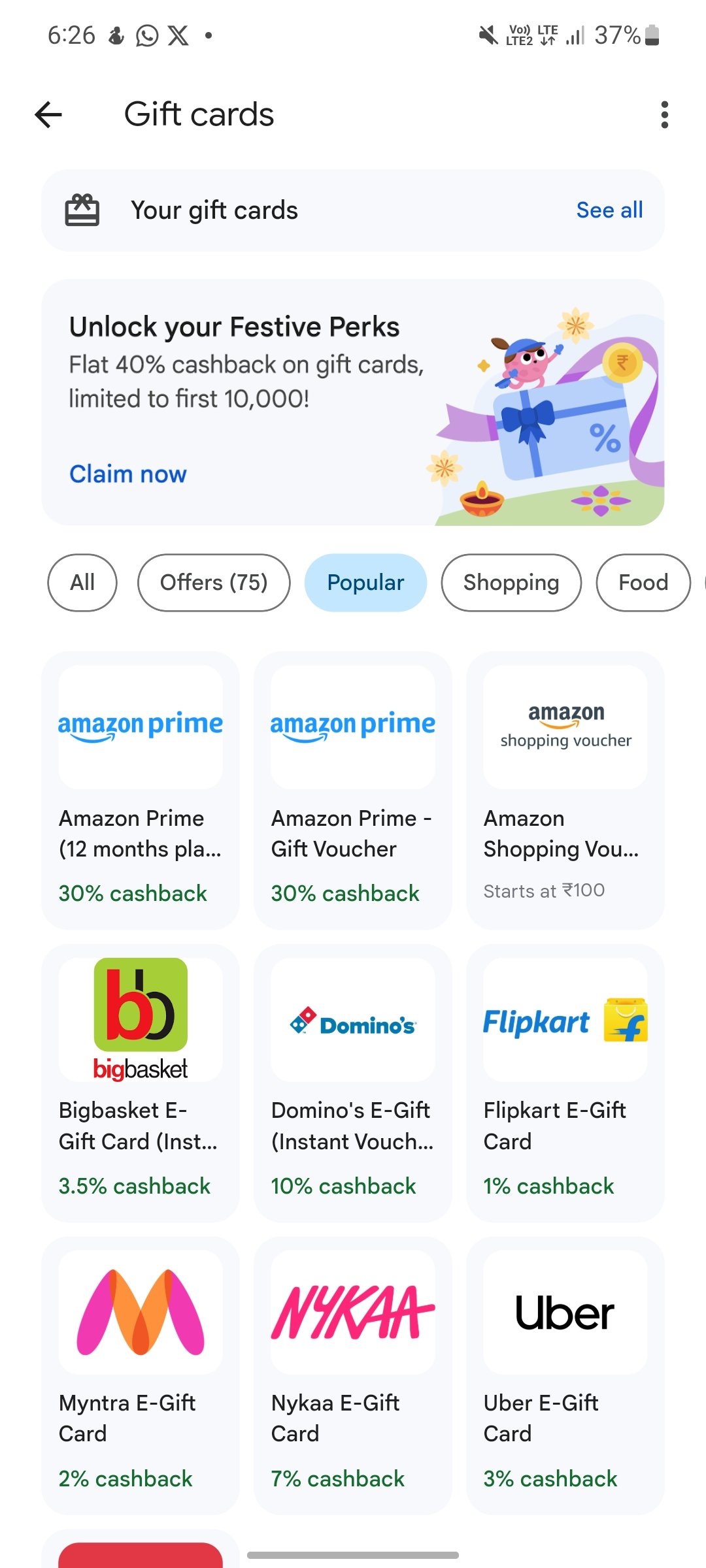 Grab an exciting offer with Google Pay! Purchase a gift card worth ₹250 or more and get 40% cashback, up to ₹100.