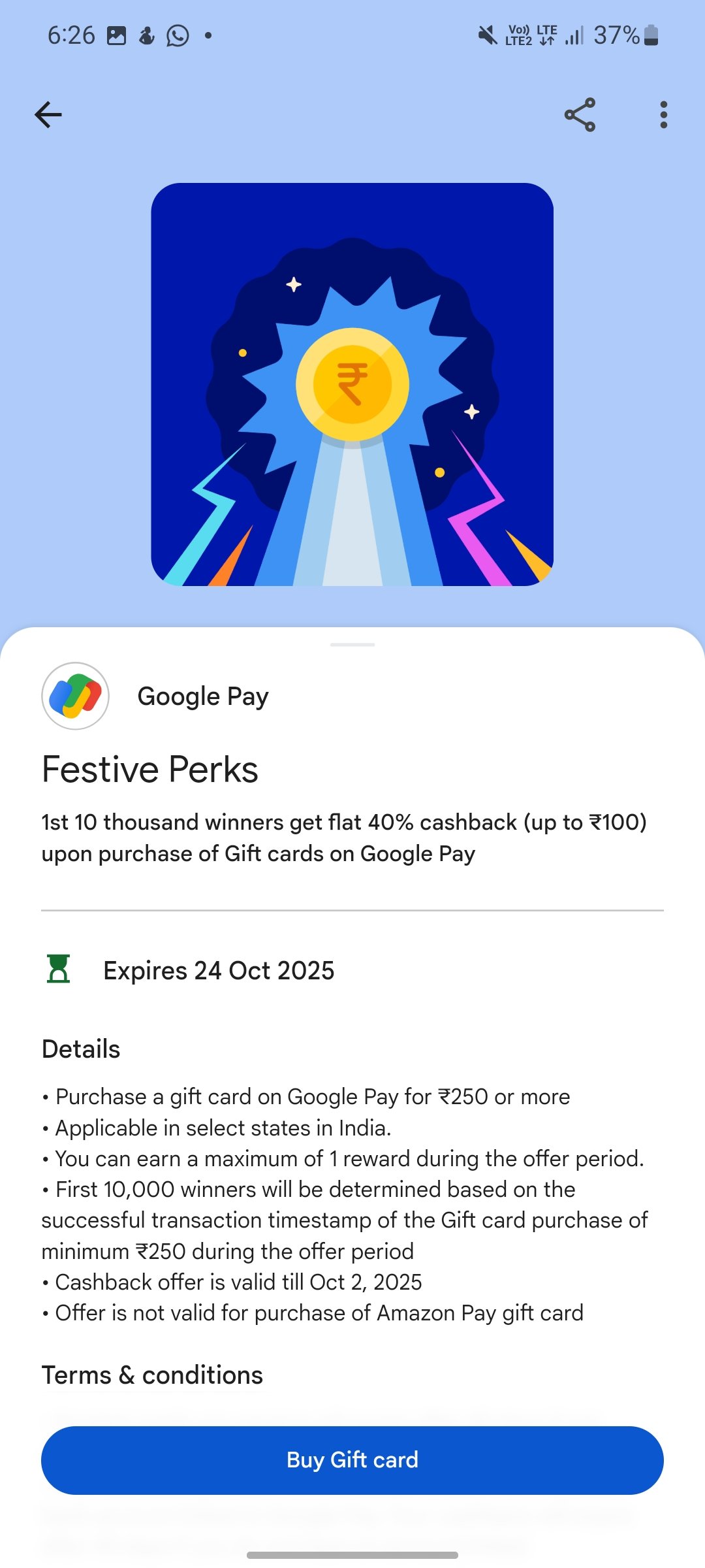 - Minimum Purchase: Buy a gift card of ₹250 or more on Google Pay.