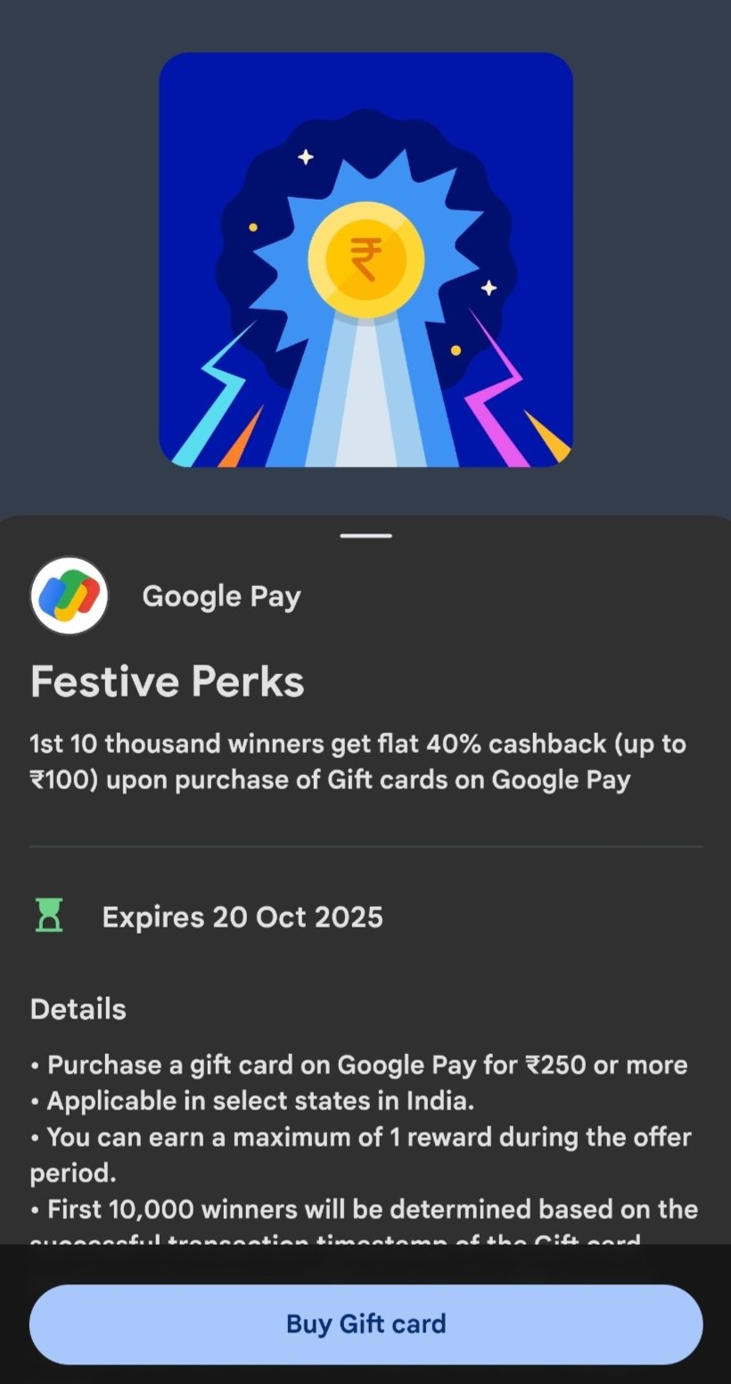 Get a flat 40% cashback, up to ₹100, when you purchase gift cards worth ₹250 or more on Google Pay. This is a user-specific "Festive Perks" offer for the first 10,000 winners.