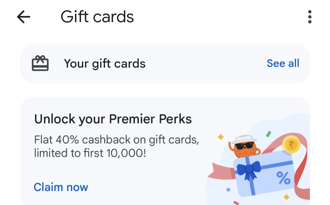 Be among the first 10,000 winners to receive a flat 40% cashback (up to ₹100) when you purchase Gift Cards on Google Pay. This exciting offer is back, providing a great opportunity to save on your favorite gift cards.