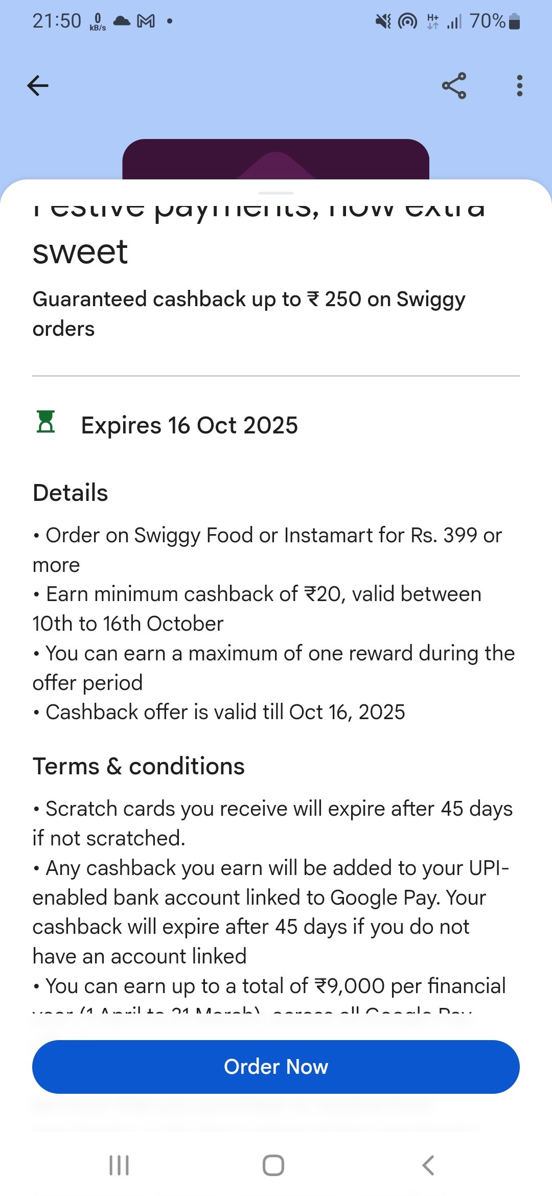Get a guaranteed cashback of up to ₹250 when you pay with Google Pay on Swiggy Food or Instamart. A minimum cashback of ₹20 is assured.
