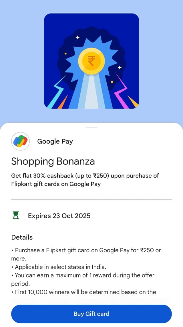 Participate in the Google Pay Shopping Bonanza and get an exciting cashback offer on Flipkart Gift Cards!