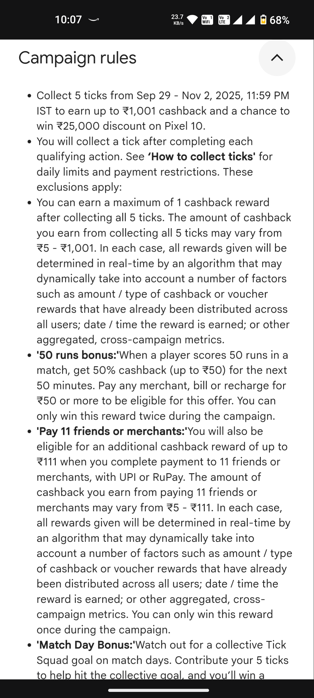 - Earn Cashback: Collect 5 ticks to get up to ₹1001 cashback.