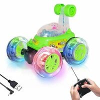 Experience thrilling playtime with the Gooyo GY9505 Stunt RC Car. This rechargeable toy features 360 rotation and dynamic rolling actions for endless fun. It comes with a USB cable for convenient charging and a remote controller with a demo feature. Powered by an included lithium battery, this green stunt car is ready for action!