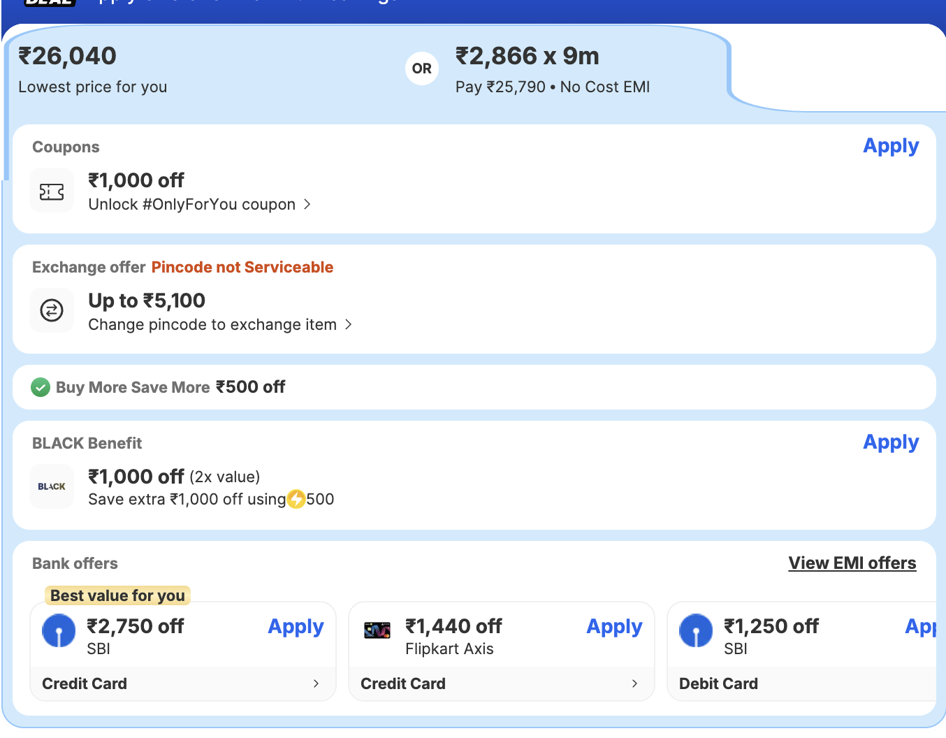 - 5% cashback on Flipkart SBI Credit Card (up to ₹4,000 per calendar quarter)