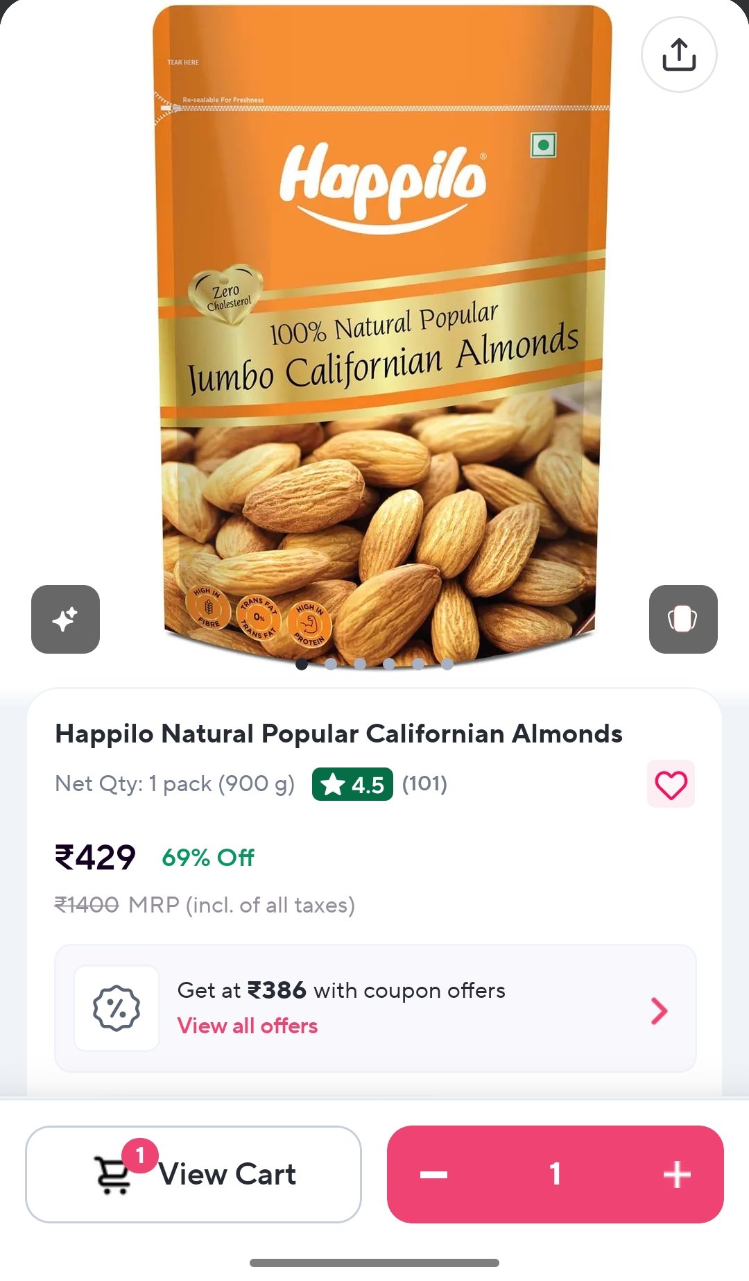 Grab a fantastic deal on Happilo Natural Popular Almonds (900g), now available at a massive 72% discount! Originally priced at ₹1400, get it for just ₹386 on Zepto. This offer is location-specific and available in Hyderabad (Pincode: 502032). Stock up on healthy snacks today!