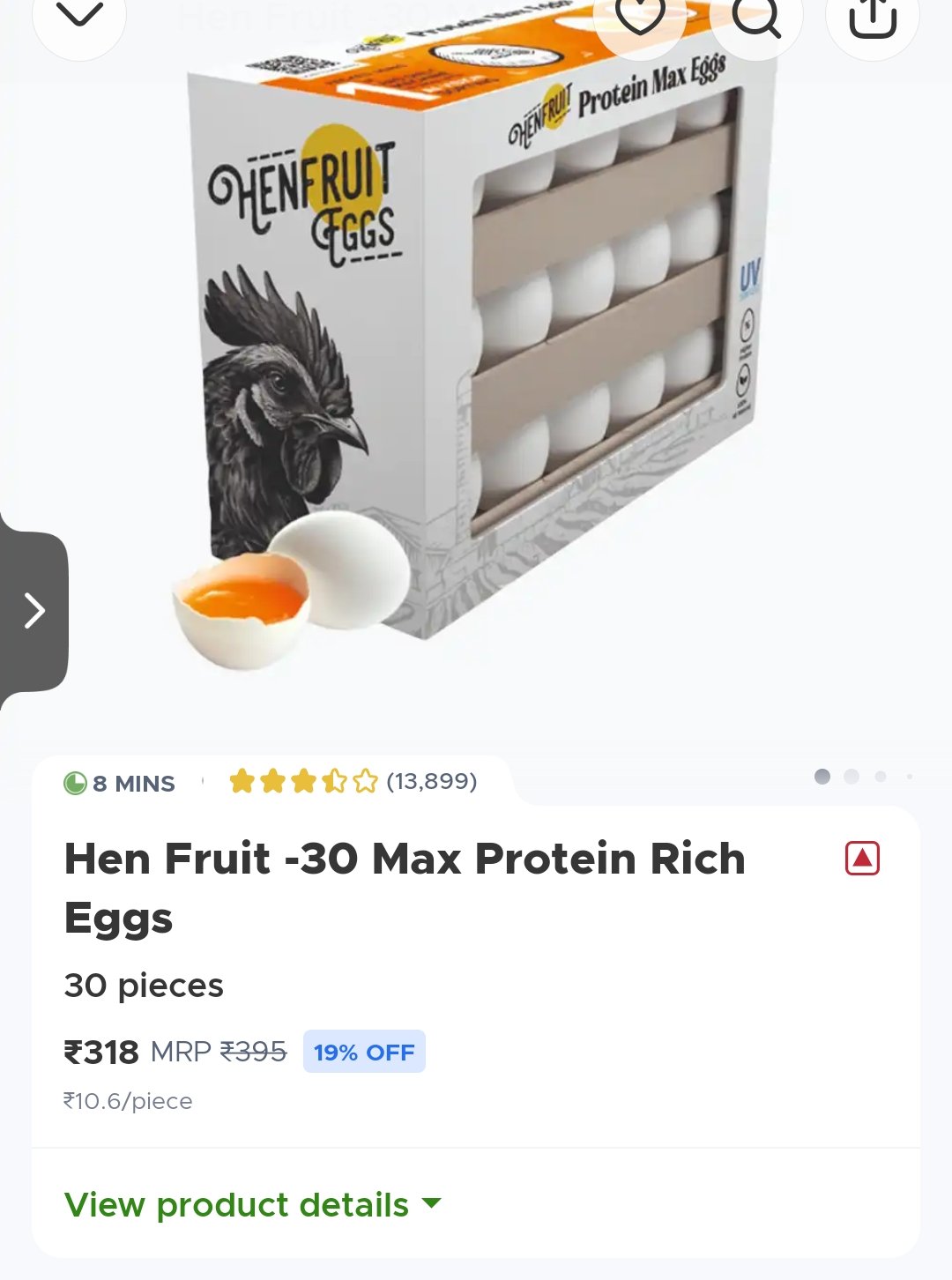 Get a fantastic 50% discount on Hen Fruit Protein Max White Eggs! Originally priced at ₹395, you can now purchase them for just ₹197. This amazing offer is available on Swiggy in Hyderabad, specifically for pincode 502032. For comparison, Blinkit currently lists this product at ₹318, making this Swiggy deal an exceptional value.